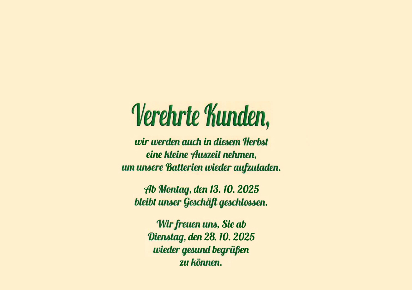 Unsere Öffnungszeiten sind von dienstags - freitags 8:00 Uhr bis 18:00 Uhr und samstags 8:00 - 14:00 Uhr.